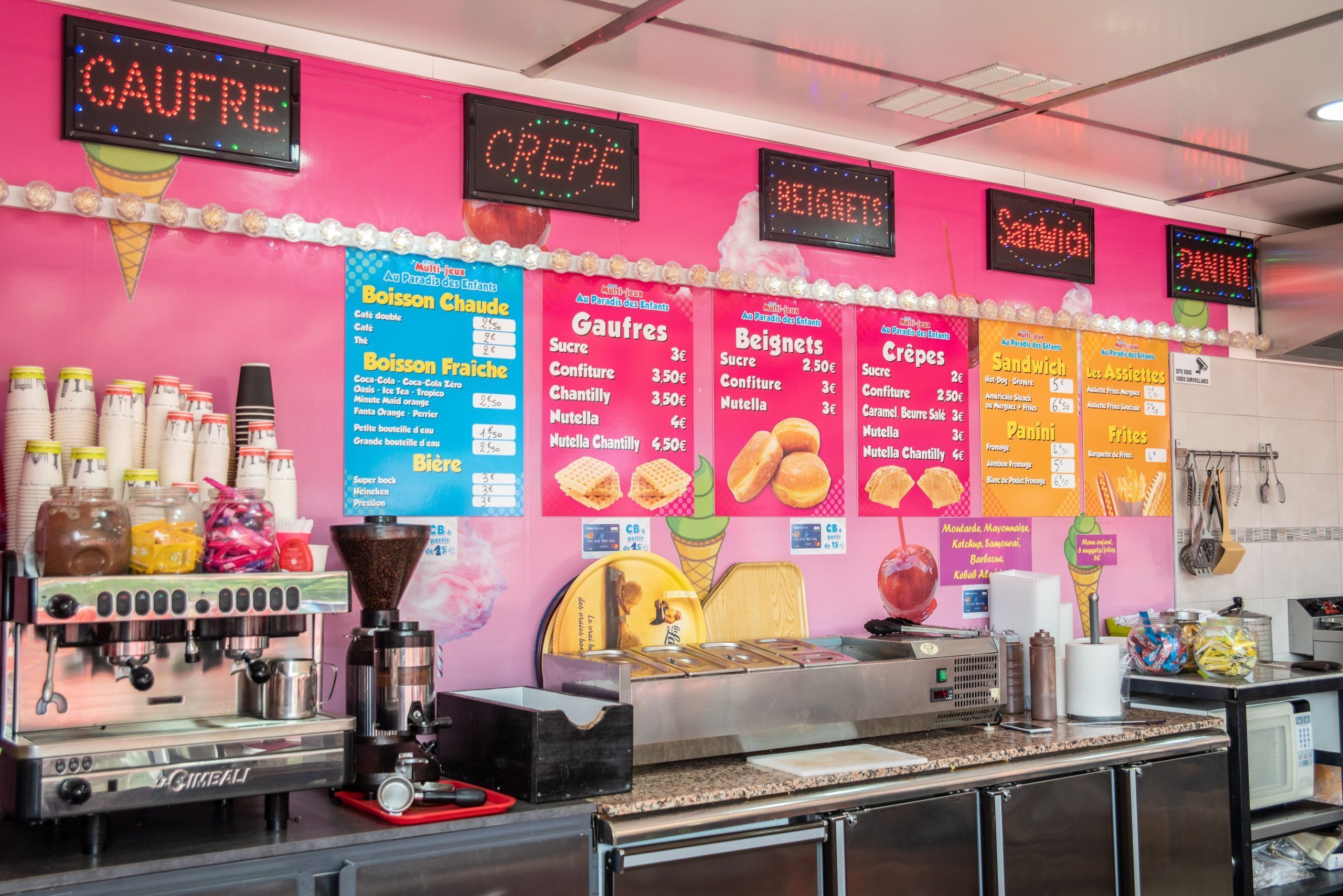 Notre snack, propose une sélection de produits salés et de nombreuses douceurs sucrées (pantins, hot-dogs, glaces à l'italienne, crêpes, gaufres...)